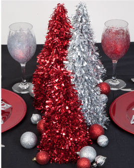 If your Christmas isn't complete without some sparkle and glam, then try this contemporary glitzy tablescape on for size. Start with a solid black tablecloth... this will really make all your colors pop! Then using just one or two accent colors, layer on the glitz with shimmery $1 plate chargers, sparkly $1 ornaments, and $1 tinsel covered trees. So easy, so affordable, and oh, so glamorous!