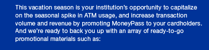 But hurry…don’t miss the benefits of promoting MoneyPass to your cardholders during this vacation season! Call your relationship manager, @profile.FULL_NAME@, at @profile.ATTR_STRING4@ today! |