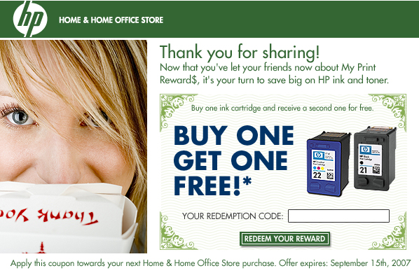 * Offer expires: September 15th, 2007. Valid for HP Home and Home Office purchases only. Limit of one free item per customer. Free item must be of equal or lesser value than the item purchased. Coupon offer is not combinable with other My Print Rewards exclusive offers. Each coupon code is limited to one usage per customer; one coupon per checkout. Offer void where prohibited, taxed or restricted by law. Non-transferable. Not valid retroactively on previously purchased items. Not valid for any resale activity as defined by HP Home and Home Office. For complete coupon conditions, see "Coupon Information" in the "Customer Service" section at www.hpshopping.com.
