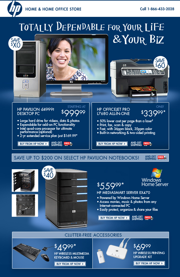 *Offer is good while supplies last. Offer is also subject to change or cancellation at any time. See product page for details. Prices shown may include applicable rebates. Restrictions apply to sale items and are subject to change without notice. HP MediaSmart Server EX470 and HP Wireless Printing Upgrade Kit offers valid through 3/29/2008.