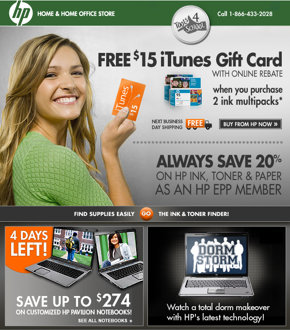 Any original HP ink cartridge $19.99 MSRP or higher is eligible for the $15 iTunes gift card. The purchase of one qualifying twin or combo pack equals two purchases. Offer valid through 9/30/2008. Offer good on purchases of qualifying HP ink cartridges made between July 1, 2008 and September 30, 2008. Products purchased before or after these dates are not eligible for this offer. Purchase date is determined by invoice or receipt date. HP product may not be returned for refund once the mail-in coupon and UPC code have been submitted. Only one entry type (electronic or mail-in) per qualifying product purchased. All orders of qualifying product(s) that have been cancelled, or products that have been returned, are NOT eligible for a gift card. This includes mail-in coupon forms or electronic submissions. Offer may be combined with other HP offers.