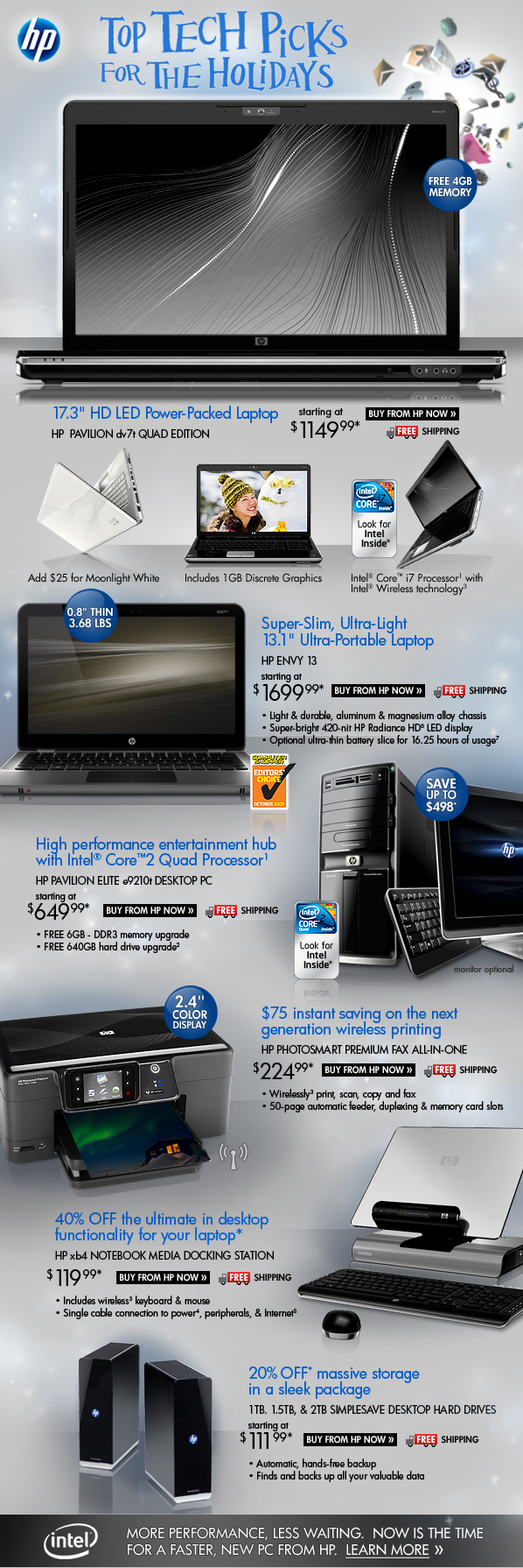 *Offer is good while supplies last. Offer is also subject to change or cancellation at any time. See product page for details. Prices shown may include applicable savings. Restrictions apply to sale items and are subject to change without notice. Offer HP Pavilion dv7t Quad Edition Notebook PC, HP ENVY 13 Notebook PC, HP Photosmart Premium Fax All-in-One Printer, HP xb4 Notebook Media Docking Station, HP SimpleSave Desktop Hard Drives valid through 11/14/2009.Offer on HP Pavilion Elite e9210t Desktop PC through 11/10/2009. Total savings on the HP Pavilion Elite e9210t Desktop PC are a combination of instant savings.
