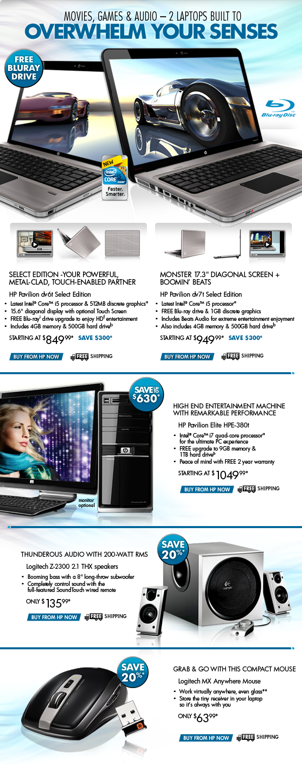 * Offer is good while supplies last. Offer is also subject to change or cancellation at any time. See product page for details. Prices shown may include applicable instant savings. Restrictions apply to sale items and are subject to change without notice. Offer on HP ENVY 17 Notebook PC, HP Pavilion Elite HPE-380t Desktop PC, Logitech MX Anywhere Mouse and Logitech Z-2300 2.1 THX speakers valid through 06/26/2010.