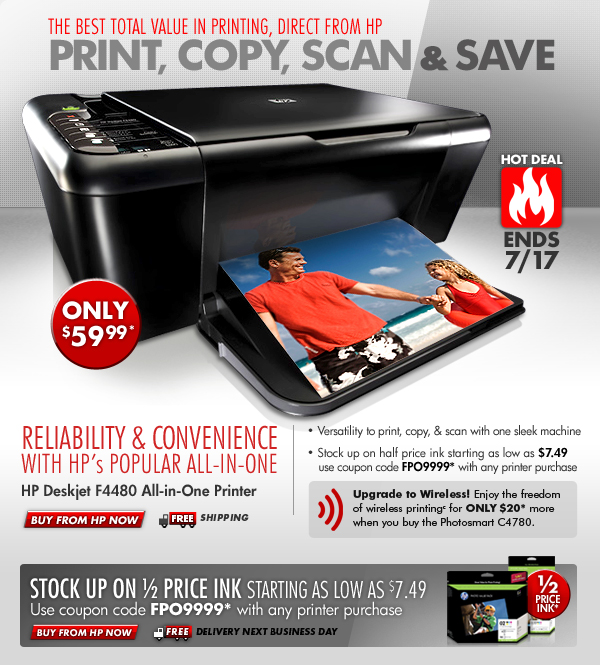 * Offer is good while supplies last. Offer is also subject to change or cancellation at any time. See product page for details. Prices shown may include applicable instant savings. Restrictions apply to sale items and are subject to change without notice. Offer on HP Deskjet F4480 All-in-One and HP Photo Value Packs valid through 7/17/2010.