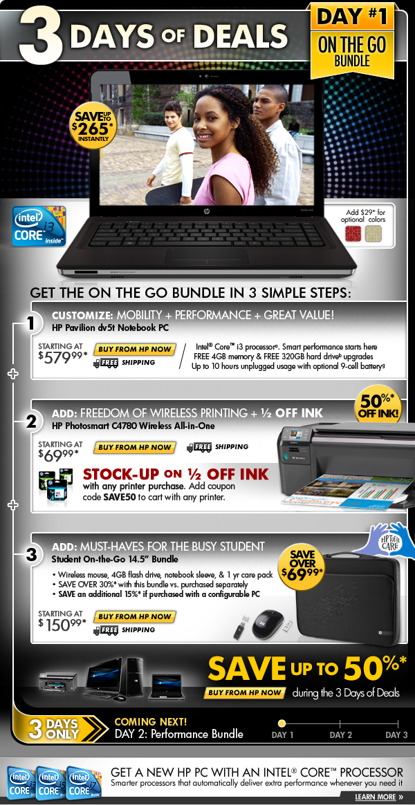 * Offer is good while supplies last. Offer is also subject to change or cancellation at any time. See product page for details. Prices shown may include applicable instant savings. Restrictions apply to sale items and are subject to change without notice. Offer on HP Pavilion dv5t Notebook PC valid through 8/17/2010. Offer on HP Officejet H470b Mobile Printer & Student On-the-Go 14.5" Bundle valid through 8/21/2010.