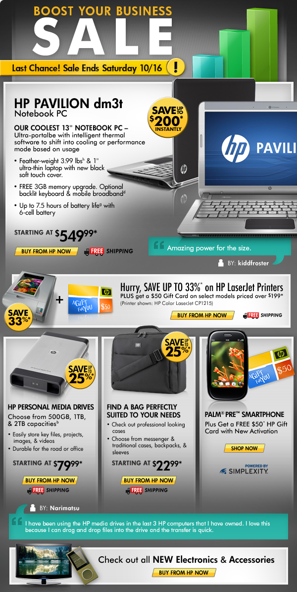 *Offer is good while supplies last. Offer is also subject to change or cancellation at any time. See product page for details. Prices shown may include applicable instant savings. Restrictions apply to sale items and are subject to change without notice. Offer on HP Pavilion dm3t Notebook PC, HP Color LaserJet CP1215 Printer, HP Carrying Cases, HP Personal Media Drives & Palm Pre valid through 10/16/2010.