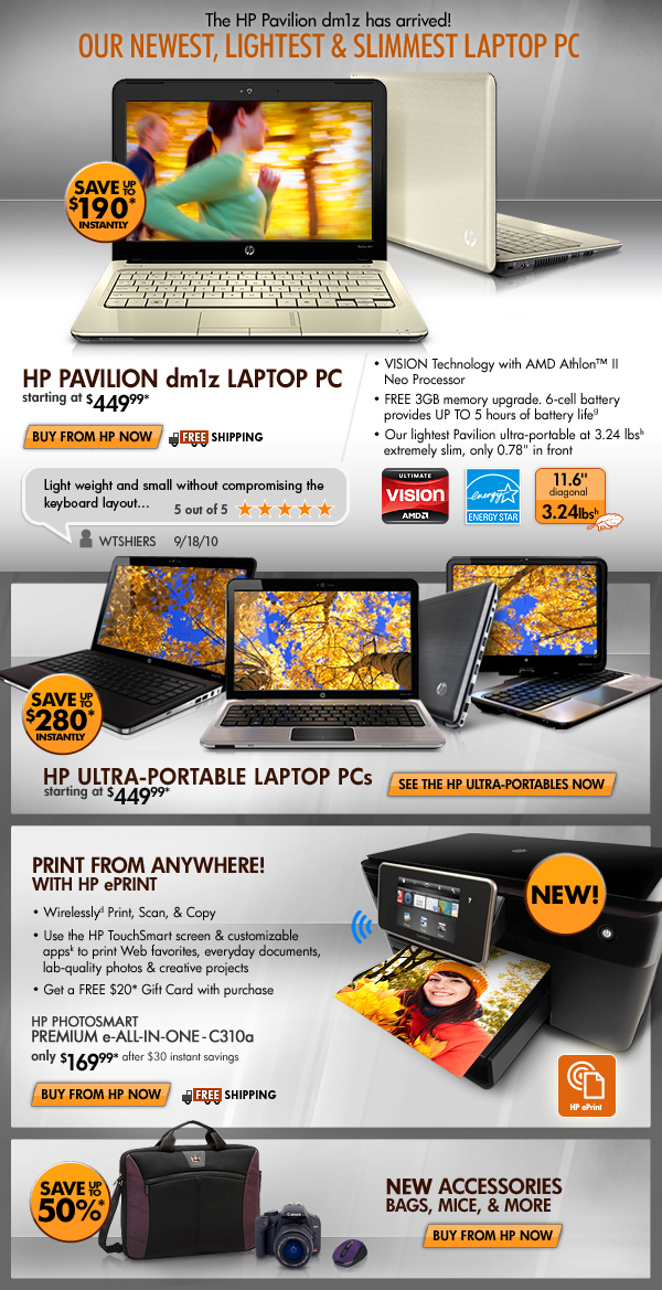 * Offer is good while supplies last. Offer is also subject to change or cancellation at any time. See product page for details. Prices shown may include applicable instant savings. Restrictions apply to sale items and are subject to change without notice. Offer on All Customizable Ultra-Portables Notebook PC valid through 11/6/2010. Offer on HP Pavilion dm1z Notebook PC valid through 11/6/2010 only. Offer on HP Photosmart Premium e-All-in-One - C310a valid through 11/13/2010.