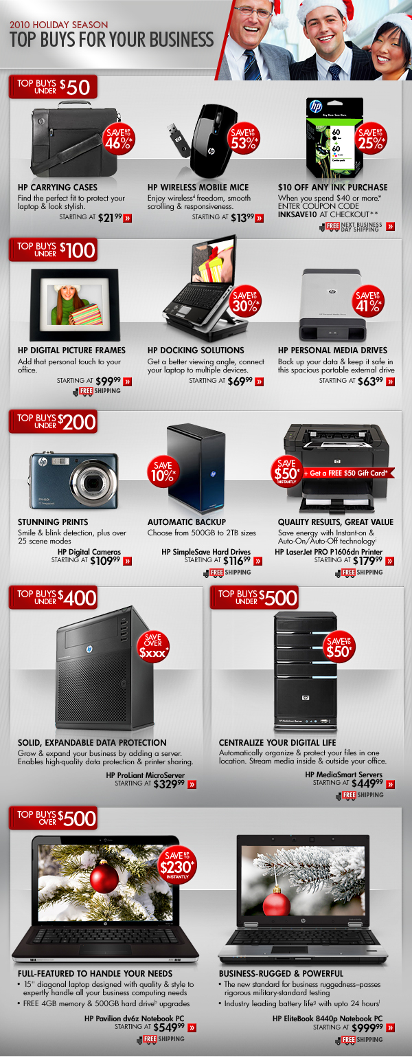 *Offer is good while supplies last. Offer is also subject to change or cancellation at any time. See product page for details. Prices shown may include applicable instant savings. Restrictions apply to sale items and are subject to change without notice. Offer on HP Carrying Cases, HP Wireless Mobile Mice, HP Docking Station, HP Pocket and Personal Media Drives, HP SimpleSave Hard Drives & HP MediaSmart Servers valid through 12/4/2010. Offer on HP Ink, HP LaserJet Pro P1606dn Printer, HP ProLiant ML110 G6 Customizable Server & HP Pavilion dv6z Notebook PC valid through 11/20/2010.