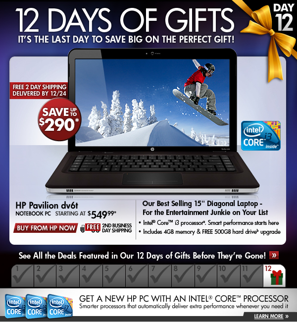 * Offer is good while supplies last. Offer is also subject to change or cancellation at any time. See product page for details. Prices shown may include applicable instant savings. Restrictions apply to sale items and are subject to change without notice. Offer on HP Pavilion dv6t Notebook PC valid through 12/15/2010.
