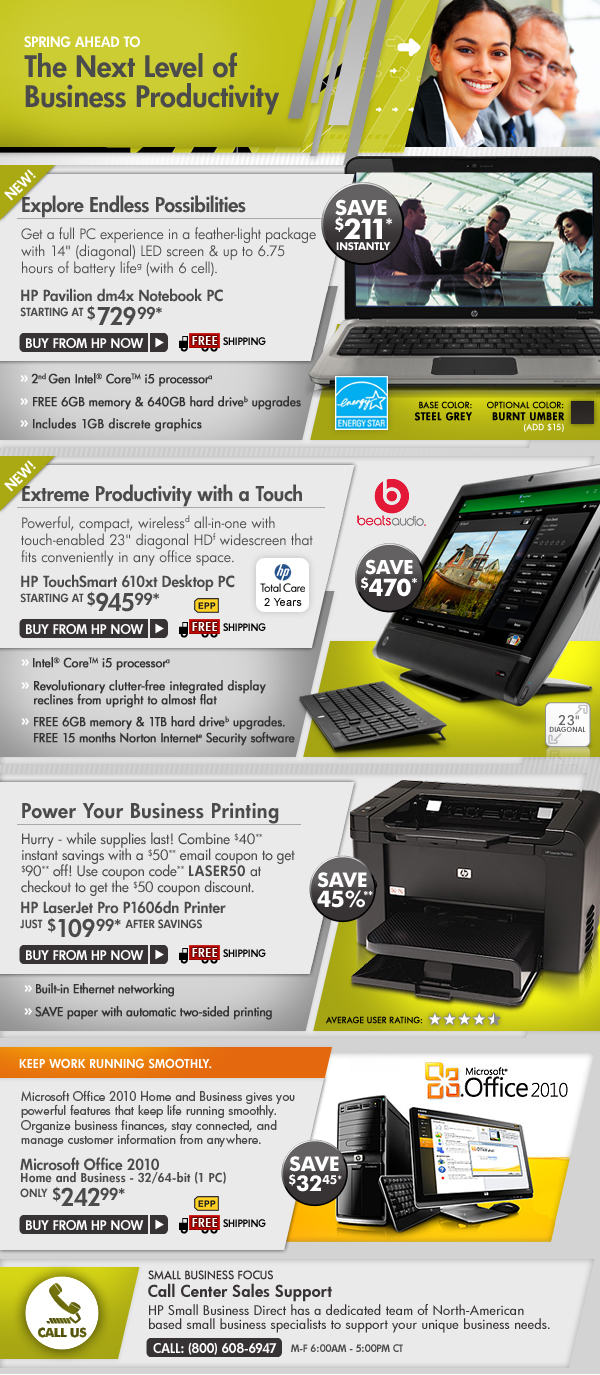 *Offer is good while supplies last. Offer is also subject to change or cancellation at any time. See product page for details. Prices shown may include applicable instant savings. Restrictions apply to sale items and are subject to change without notice. Offer on HP TouchSmart 610xt Desktop PC valid through 5/13/2011. Offer on HP LaserJet Pro P1606dn Printer and Microsoft Office 2010 Home and Business - 32/64-bit - 1 PC valid through 5/14/2011. Offer on HP Pavilion dv7t Notebook PC valid through 5/17/2011. **need printer offer disclaimer. Intel, the Intel Logo, Intel Inside, Intel Core, and Core Inside are trademarks of Intel Corporation in the U.S. and other countries. a Intel’s numbering is not a measurement of higher performance. Multi-Core is designed to improve performance of certain software products. Not all customers or software applications will necessarily benefit from use of this technology. 64-bit computing on Intel architecture requires a computer system with a processor, chipset, BIOS, operating system, device drivers and applications enabled for Intel® 64 architecture. Processors will not operate (including 32-bit operation) without an Intel 64 architecture-enabled BIOS. Performance will vary depending on your HW and SW configurations. See www.intel.com/info/em64t. b For hard drives, GB=1 billion bytes. Actual formatted capacity is less. Up to 16GB of system disk is reserved for system recovery software. d Wireless access point and Internet service required and not included. e Internet service required and not included. f HD content required to view HD images. g Battery life will vary depending on the product model, configuration, loaded applications, features, use, wireless functionality (including the wireless functionality) and power management settings. The maximum capacity of the battery will naturally decrease with time and usage. See MobileMark07 battery benchmark www.bapco.com/products/mobilemark2007 for additional details. If you no longer want to receive the HP Small Business Direct Store emails, please click unsubscribe. To unsubscribe from all marketing emails from HP, including HP Small Business Direct Store, special offers and information, please reply with "UNSUBSCRIBE" as the subject line. For more information about HP privacy practices, read the online privacy statement. To ensure you receive your HP Small Business Direct Store offers, please add news@mail.hpshopping.com to your address book. Need help? Click here. We try hard to make sure all of the information in our email is correct, but sometimes mistakes do happen. HP Small Business Direct Store is not responsible for typographical errors. HP Small Business Direct Store: 1501 Page Mill Road, Bldg 5U, MS1407, Palo Alto, CA 94304 |