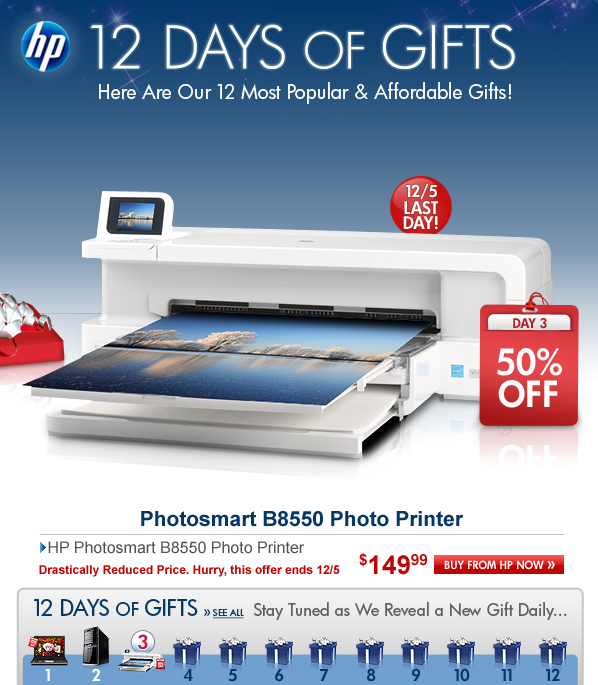 Offer is good while supplies last. Offer is also subject to change or cancellation at any time. See product page for details. Prices shown may include applicable instant savings. Restrictions apply to sale items and are subject to change without notice. Total savings are a combination of instant and coupon savings. Offer on HP Photosmart B8550 Photo Printer valid through 12/5/2009.