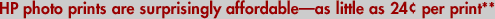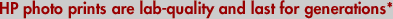 http://hp.com/go/premiumplusphoto. ** Based on estimated retail price of HP 95 200ct 4" x 6" Photo Value Pack, 3-ink printing. Actual cost may vary based on printer used, images printed, and other factors. *** Memory card slots support CompactFlash,TMIBM Microdrive, Memory Stick Duo® (with adapter, not included, purchase separately), Mini SD (with adapter, not included, purchase separately), Secure Digital/MultiMedia Card and XD-Picture Card™ **** Up to 4800x1200-optimized dpi color when printing from a computer and 1200-input dpi. † PC Magazine 4.5 Stars Rating Logo is a trademark of Ziff Davis Publishing Holdings Inc. Used under license. ‡ Reprinted from www.pcmag.com, October 19, 2004, with permission. Copyright © 2005 Ziff Davis Publishing Holdings Inc. All Rights Reserved. |