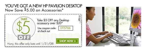 *Valid for HP Home and Home Office (www.hpshopping.com) purchases only. Any unused portion will be forfeited. Each coupon code is limited to one usage per customer; one coupon per product. Offer void where prohibited, taxed or restricted by law. Non-transferable. Not valid retroactively on previously purchased items. Not valid for any resale activity as defined by HP Home and Home Office. Not valid on: instant rebates, or clearance sales, products combined with others in a bundle. Not valid on: Academic and Employee purchase programs, HP Employee purchase program, Refurbished products, Compaq Presario and HP Pavilion desktops with Celeron or AMD Sempron processors or Compaq Presario V6000T, V6000Z and C500T customizable notebooks. For complete coupon conditions, see "Coupon Information" in the "Customer Service" section at www.hpshopping.com.