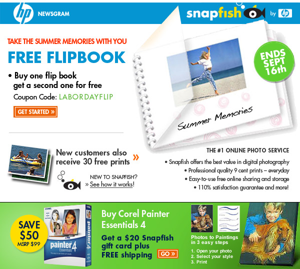 * Free flip book offer applies to a mail-order, 5-page 4" x 6" flip book. To get the second 4" x 6" flip book free, it must be ordered with first flip book. Additional pages are charged at regular price. Does not apply to taxes or shipping and handling. Use coupon LABORDAYFLIP at checkout. Offer expires 9/16/2008.