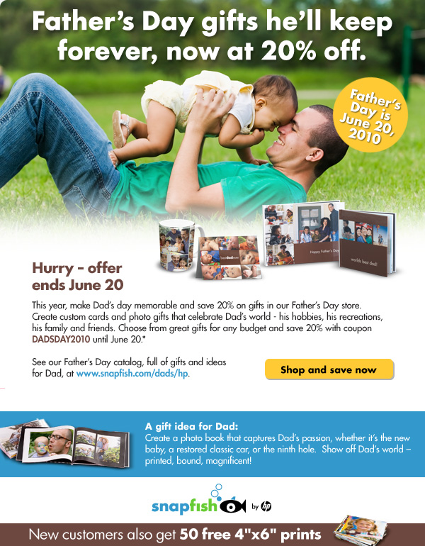 * 20% off offer applies to products in the Father's Day store, using coupon DADSDAY2010. The offer does not apply to prints, pre-paid prints, and gift certificates. Coupon may be used only once. New customers will receive 50 free 4"x6" mail order prints upon first upload. Offers apply to mail-order purchases only and cannot be used for in-store pick up. Tax, shipping, and handling charges apply. Offers good for U.S. customers only. Offers may not be used in conjunction with any other promotion. Prices and products are subject to change, without notice. Offers expire 6/20/2010.