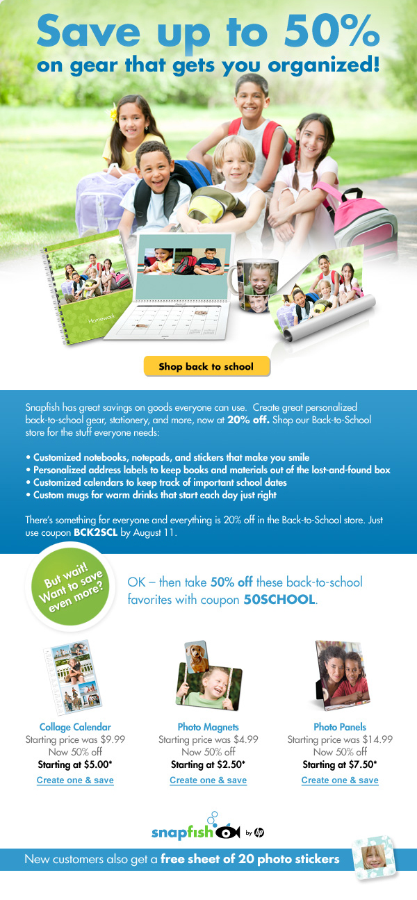 * Use coupon code 50SCHOOL at checkout to get 50% off price of Collage Calendars, Photo Magnets, and Photo Panels only. Coupon is good through 8/11/10 and may be used only once. Offer applies to mail-order purchases only and cannot be used for in-store pick-up. Taxes, shipping and handling charges apply. Offer may not be used in conjunction with any other offer.