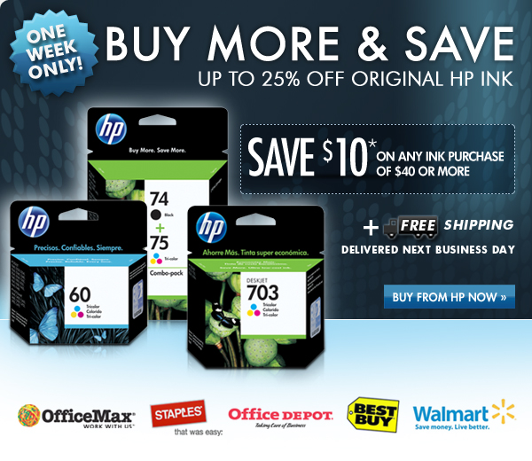* Offer valid August 29 - September 4, 2010. Must add coupon code SAVE10 at checkout when purchasing online direct from HP. Retailer participation may vary, please see each retailer for terms and conditions.