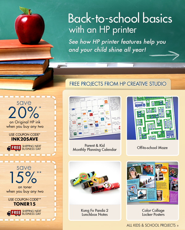* Ink coupon valid through 8/6/11. Must buy 2 inks. INK20SAVE is executed as: buy 1 ink, get the next 1 at 40% off. 20% off is based on buying two of the same ink. When purchasing two different inks, the 40% discount will be taken off the lowest priced ink. Multipacks count as 1 unit. Limit use per cart is 5. Valid for HP Direct (hpdirect.com) internet and call center purchases only. Coupon valid while supplies last. Any unused portion will be forfeited. Each coupon code is limited to one usage per customer; one coupon code per checkout. Offer void where prohibited, taxed or restricted by law. Non-transferable. Not valid retroactively on previously purchased items. Not valid for any resale activity as defined by HP Direct. Coupons may not be used to purchase gift cards. May not be permitted with certain bundle offers. Products and support acquired by Customer under these Terms are solely for Customer's personal use and not for immediate resale or sub-licensing. Not valid on purchases from HP download store (hp.digitalriver.com). Offer combinable with Instant Rebates. For complete coupon conditions, see "Coupon Information" in the "Customer Service" section at www.hpdirect.com.
