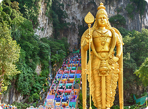 | “The Batu Caves are 400-million-year-old limestone caves with a 100-year-old Hindu Temple inside. At the entrance of the main temple (272 steps up) you'll be greeted by the gold, 140-foot Lord Murugan Statue, which can be seen from miles away.” |