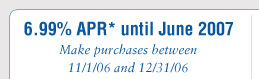 | *We may change APRs, fees and other Account terms in the future as provided under the Cardmember Agreement and applicable law. Your account must remain open and current (no minimum payment past due) to receive the promotional rate. The rate will end early and increase to the current applicable APR if your Account is delinquent, over the limit or closed. We apply payments to balances with lower APRs, including promotional APRs, before balances with higher APRs. The variable APR for purchases or any Delinquency Rate then in effect will apply to any outstanding balances after the promotional period ends. Your promotional daily periodic rate of 0.0192% (corresponding 6.99% ANNUAL PERCENTAGE RATE) will be applied to all purchases made after the required @profile.DECLARED_INTEREST21@ in spending has been made between November 1, 2006 and December 31, 2006. This promotional rate: